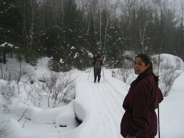 We slid around on the flat area by the parking lot a bit to get him vaguely familiar with how you moved forward in the tracks. He quickly decided that was boring and we really should go into the forest.
